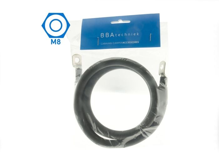 De voorgemonteerde accukabel is voorzien van 2 M8 kabelogen en een krimpkous afwerking, wat zorgt voor een stevige en betrouwbare verbinding. De zwarte kleur en flexibele opbouw maken de kabel ideaal voor zowel professionele als doe-het-zelf installaties.