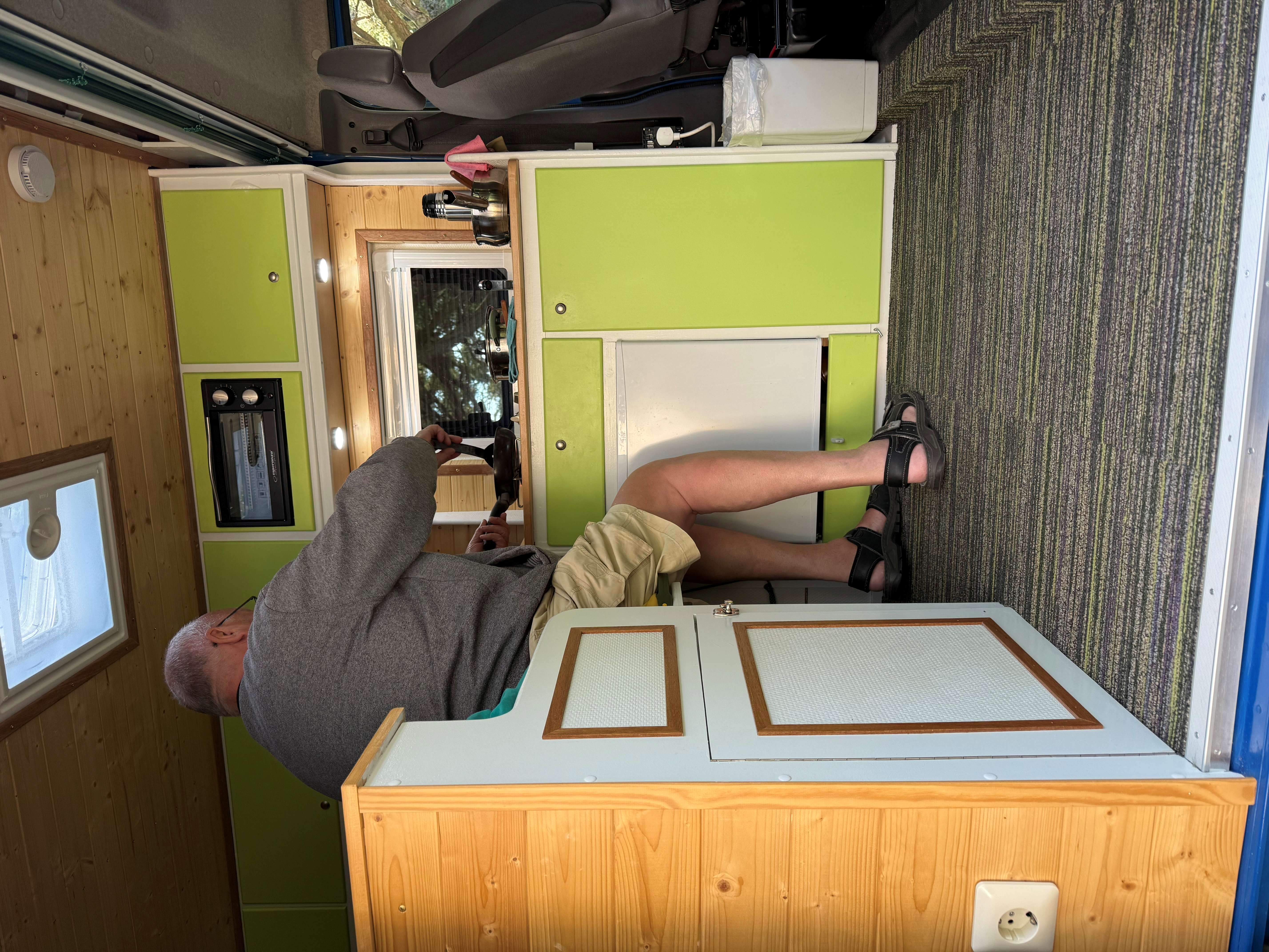 “De bus stond op het gras in de voortuin. Je hebt een plan en begint. Ik begon in de schuur met het maken van bovenkastjes. Niks was er recht in die bus, dus passen en meten en soms gewoon opnieuw beginnen. Gaandeweg als je bezig bent en er iets gaat ontstaan, krijg je er vanzelf inspiratie van… zo ga ik het doen. Je leest op internet hoe je dingen kunt doen en waar je op moet letten. Oplossingen en spullen zoeken in de winkel. Soms advies vragen aan de servicebalie over wat ik het beste kan gebruiken, enzovoort.”