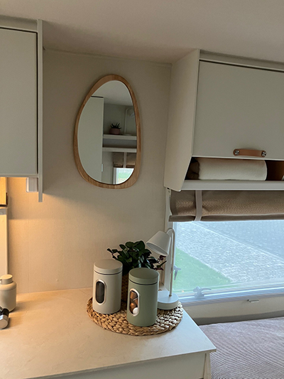“Ik heb destijds eigenlijk meteen de caravan aangepast: allereerst de ombouw van een grote zit naar een vast bed. Daarnaast heb ik met hulp van mijn moeder alle stoffen bekleding vervangen, dat voelde frisser aan en paste meer bij mijn smaak. Daarin zocht ik wel naar stof die een link kon maken tussen mijn lievelingskleur (mintgroen) en de oranje-tint van het houten interieur, en waarop je niet te snel vlekken zag omdat de caravan wel relaxt gebruikt moest kunnen worden door de kinderen.”