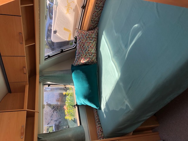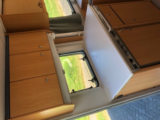 “Op de plek van het stapelbed en de kleine zit is een groot vast bed gekomen. Dit bed is extra hoog, zodat er veel bergruimte onder is. Ook is er tussen dat bed en het toilet ruimte gekomen voor een extra kast, met legplanken. Het toilet is opgeknapt waarbij meer ruimte is om handdoeken e.d. op te hangen, doordat het wasbakje weg is. Dat zit recht tegenover het toilet in de keuken, die nu twee keer zo groot is. Dat komt doordat er een andere koelkast in zit zonder wieluitsparing op een iets andere plek.”