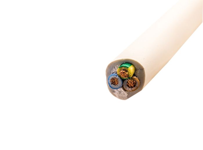 De kabel heeft een aansluitspanning van minimaal 230V en is voorzien van een robuuste PVC isolatie. De aders zijn gekleurd volgens de gangbare norm: bruin, blauw en geel/groen voor eenvoudige identificatie en installatie.