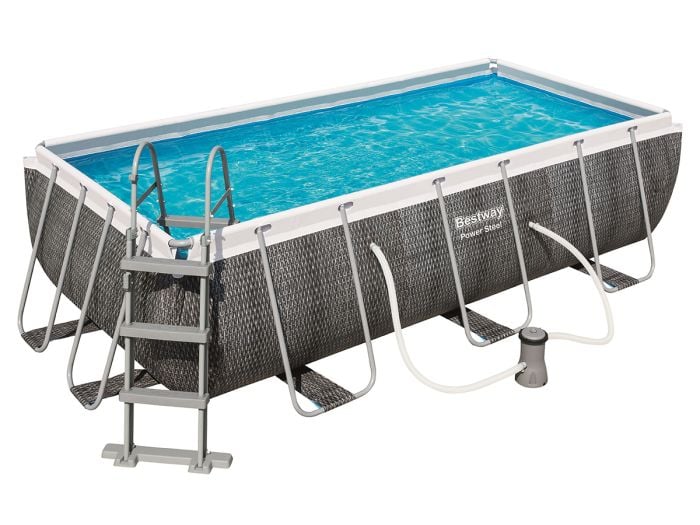 Dit ruime Bestway Power Steel zwembad wordt geleverd inclusief trap en staat garant voor een zomerlang waterpret voor de hele familie!  Het Bestway Power Steel bovengrondse zwembad heeft een roestbestendig stalen frame met seal & lock systeem. De wanden zijn gemaakt van sterk, UV en chloorbestendig Tritech materiaal en de liner heeft een trendy rotan look, Met de meegeleverde filterpomp inclusief filter cartridge type II en chloordrijver houd je het water schoon Het Bestway Power Steel rotan zwembad heeft een lengte van 404 cm, een breedte van 201 cm en een hoogte van 100 cm. Dit Bestway zwembad is snel en zonder gereedschap te monteren. Aan het eind van het seizoen is het zwembad net zo snel weer opgeborgen.         Specificaties:-Bovengronds frame zwembad met filterpomp-Inclusief trap-Lengte binnenmaat: 404 cm-Breedte binnenmaat: 201 cm-Hoogte: 100 cm-Watercapaciteit: 6478 liter-Materiaal: PVC, polyester en staal -Rotan look liner-Frame seal & lock systeem-Inclusief filter pomp en filter cartridge (type II)