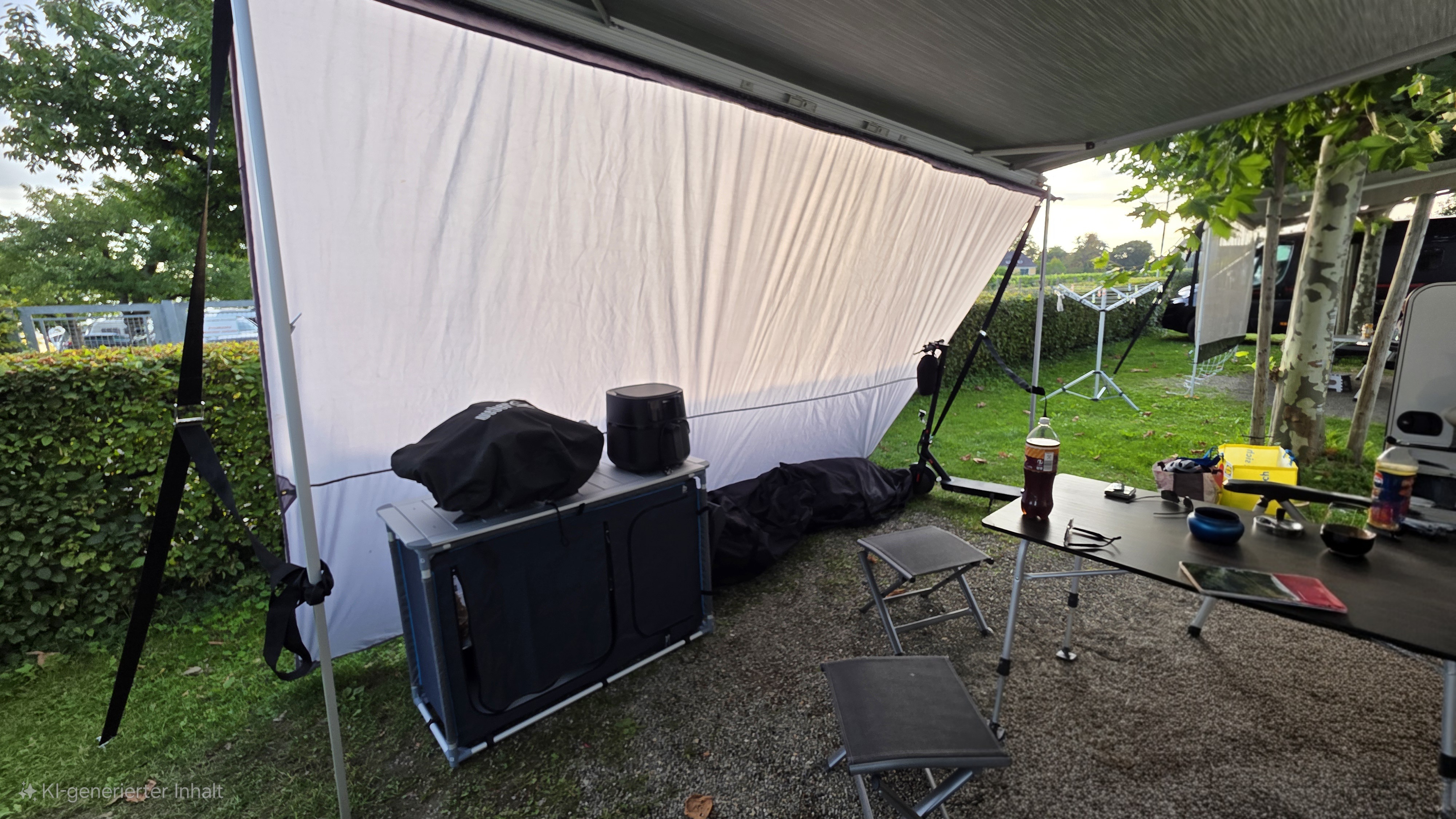 Draagtas, Ventilatiegaas aan achterzijde, Verstelbare poten, Windscherm, Ruimte voor gasfles, Wasbak, Oprolbaar blad