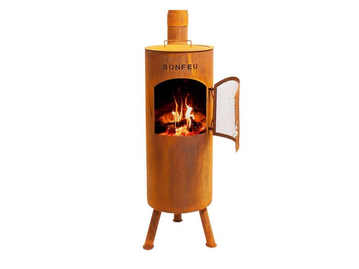 De BonGiano LP Roest is een eyecatcher op het terras en staat voor gezelligheid en warmte. De 164 cm hoge tuinhaard heeft een doorsnede van 30 cm en is ook te gebruiken als barbecue en wok. Bij het product worden een BBQ-grill, wok ring, deksel en een pook wordt bijgeleverd. Met de optionele bakplaat is het mogelijk de ideale BBQ samen te stellen. De haard is voorzien van 3 poten met een brede basis voor optimale stabiliteit, evenals een handig vonkenscherm voor extra veiligheid. De kachelpijp heeft een doorsnee van 10 cm. Het logo van BonFeu is aan de voorkant uitgesneden, wat mooi zichtbaar is in het vuur. Het product is beschikbaar in het zwart en in roest. De BonGiano LP is de langere versie van de BonGiano SP.