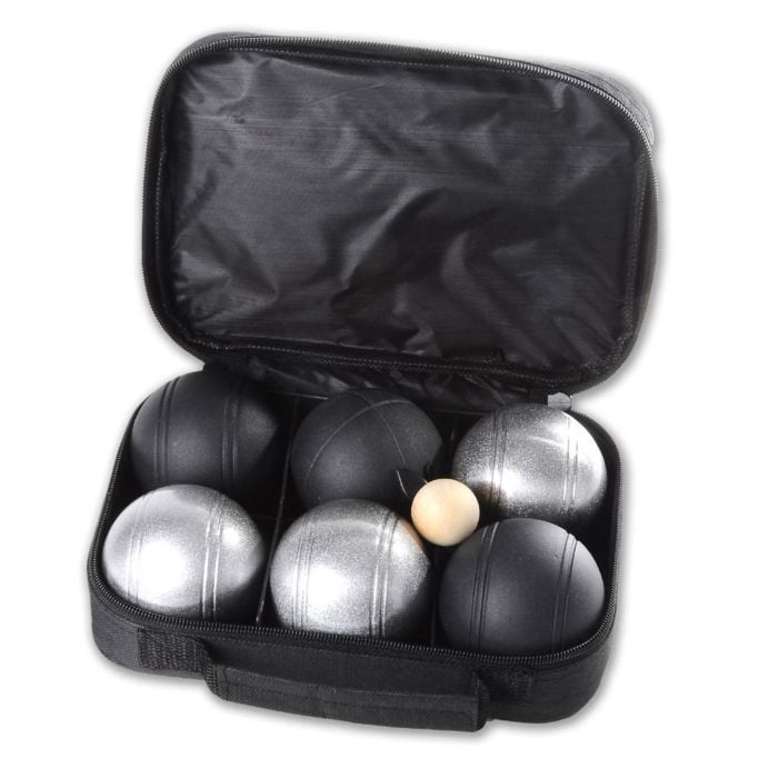 Luxe Jeu de Boules set bestaande uit drie gepoedercoat mat zwarte en drie zilveren metalen ballen. De Jeu de Boules set wordt geleverd in een zwarte tas met rits compleet met but, meetlint en spelregels. De striage (groeven) op de ballen kan afwijken van de foto's. Specificaties:-Zes metalen ballen-Diameter ballen 74 mm-But-Meetlint-Etui met rits-Spelregels meegeleverd