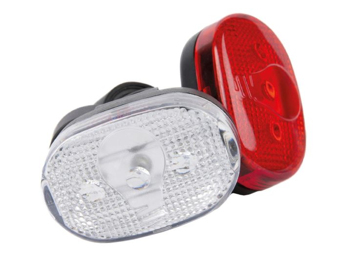 Werkt op batterijvoeding, met Duits keurmerk. Bestaat uit LED-koplamp "HL-380" en LED-achterlicht "TL-380". Wordt geleverd inclusief 2 AA batterijen en 2 ladycellen LR01.