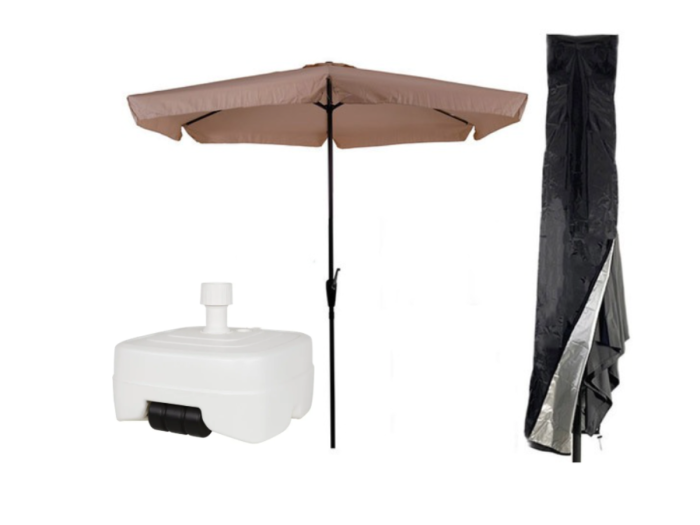 Met de witte vulbare voet en de Redlabel hoes staat de parasol stevig en blijft hij optimaal beschermd tegen regen, vuil en verkleuring.