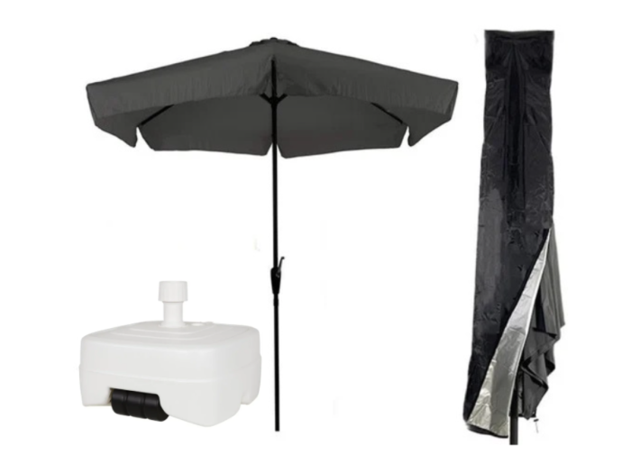 Met de witte vulbare voet en de Redlabel hoes staat de parasol stevig en blijft hij optimaal beschermd tegen regen, vuil en verkleuring.