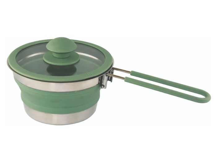 Opvouwbare pan met deksel met handgreep. De pan is invouwbaar en de handgrip kan men na gebruik over de pan heen vouwen. Hierdoor ontstaat een klein pakketje wat je overal kunt opbergen. Ideaal voor gebruik op de camping.