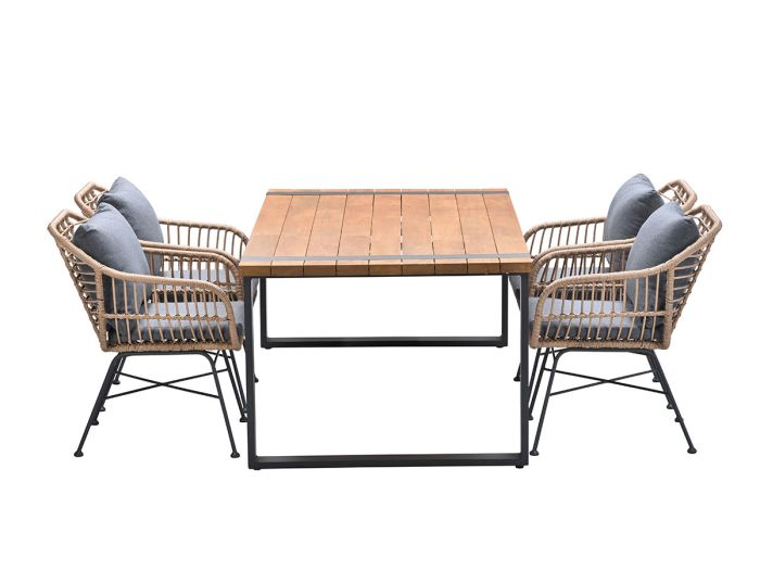 Op zoek naar een ronde prachtige tuinset met een robuuste houten tuintafel? Bekijk dan eens deze Lucas – Alto tuinset 5-delig met teakhouten tuintafel. Deze tuintafel wordt met comfortabele tuinstoelen gecombineerd. Een prachtige tuinset met een landelijke robuuste uitstraling. De tuinstoel heeft een frame van aluminium en het onderstel is gemaakt van staal. Om het aluminium zit bruin vlechtwerk met de hand gevlochten. De buiten stoel dient nog gemonteerd te worden bij levering. De poten kunnen op een gemakkelijke wijze vast worden gemaakt. De tuinstoel wordt geleverd inclusief een grijskleurig zitkussen. Het kussen is voorzien van een rits, waardoor de hoes gemakkelijk met de hand gewassen kan worden. De Alto tuintafel heeft een tafelblad gemaakt van teakhout. Het onderstel van deze prachtige tuintafel is gemaakt van aluminium. Teakhout is van nature een vettige houtsoort en hierdoor zeer duurzaam en uitstekend geschikt voor buiten. Zonder behandeling zal teakhout in de buitenlucht ruwer aan de oppervlakte worden en kunnen er op den duur haarscheurtjes ontstaan. Dit alles doet geen afbreuk aan de kwaliteit van de tuintafel, het geeft de tuintafel wel een natuurlijke uitstraling. In de buitenlucht zal het hout vergrijzen. Wanneer je de originele kleur wilt behouden, dan is twee maal per jaar een onderhoudsbeurtje noodzakelijk. Dit kan je eenvoudig doen door de tuintafel te behandelen met een teak reiniger & hersteller. Na het reinigen en herstellen van het teakhout dient het hout weer beschermd te worden tegen weersinvloeden. Dit kan eenvoudig door het teakhout te behandelen met teakolie. De tuinstoel heeft een afmeting van 59 bij 69,5 cm en is 82,5 cm hoog. De tuintafel heeft een afmeting van 180 bij 100 cm en is 75 cm hoog. De hoogte tot de onderkant van het tafelblad bedraag 72 cm.