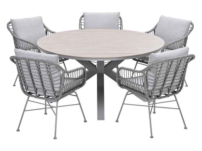 De tuinstoel heeft een afmeting van 59 bij 69,5 cm en is 82,5 cm hoog. De tuintafel heeft een ronde vorm en heeft een doorsnede van 148 cm. De hoogte van het tafelblad is 75 cm. De hoogte tot de onderkant van het tafelblad is 69,5 cm.