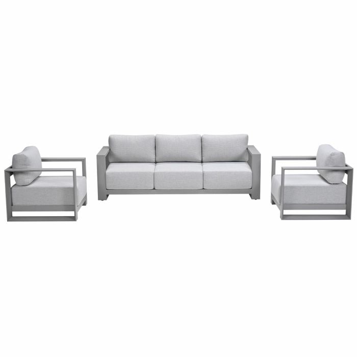 De 3-delige Malakka loungeset met taupe frame combineert een strak design met een comfortabele zit en brede armleuningen.