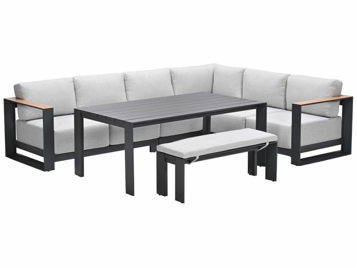 De set is vervaardigd uit een onderhoudsvrij en weerbestendig aluminium frame met een stevige poedercoating, wat zorgt voor duurzaamheid en een lange levensduur. De Malakka lounge dining set bestaat uit twee banken, een middenelement, een hoekelement, een sportbank en een hoge tafel. Voor wie de set verder wil uitbreiden, biedt de veelzijdige Malakka-serie verschillende opties, waaronder een 3-zitsbank, loungestoelen en loungetafels. Hiermee kun je de set volledig aanpassen aan jouw wensen.