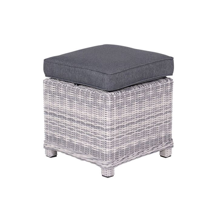 Het Nova krukje is een praktische aanvulling in de Nova serie. Dit krukje kan gebruikt worden als extra zitplaats of als voetenbankje, zodat je bijvoorbeeld heerlijk met de voeten omhoog kunt genieten van een goed boek. Het krukje wordt geleverd inclusief een comfortabel dik kussen. Het krukje is voorzien van een aluminium binnenframe met daaromheen hand gevlochten 5mm half rond kunststof wicker draad in de kleur cloudy grey. Het krukje wordt geleverd met dik kussen. Het kussentje is voorzien van een rits, waardoor het hoesje gemakkelijk met de hand kan worden gewassen. Het kussen is niet 100% waterdicht, maar is wel voorzien van een waterafstotende coating. Dit is vooral erg praktisch als er bijvoorbeeld op het kussen wordt gemorst met drinken. Je veegt het vocht er namelijk gemakkelijk weer af. Na gebruik kan het kussen opgeborgen worden in de schuur of in een kussenbox. Wil je niet alleen een Nova krukje, maar naar eigen wens een geweldige set opstelling samenstellen? Bij de Nova serie is het allemaal mogelijk. De Nova serie bestaat uit: losse banken, tafels, stoelen en complete hoekbank opstellingen. Op deze manier is er voor iedere tuin een passende opstelling te maken. Uiteraard zijn al deze artikelen leverbaar in diverse kleurstellingen. De afmetingen van deze kruk zijn: B 47 x D 47 x H 50 cm.