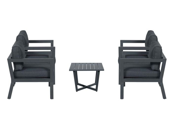 Het frame van de lounge fauteuil en Kent bijzettafel zijn van aluminium en is voorzien van een carbon black kleurige poedercoating. De lounge stoel kan eventueel als uitbreiding worden gebruikt bij de San Luis loungeset of gewoon als losse lounge stoel in de tuin. De lounge fauteuil wordt geleverd met comfortabele kussens van 9cm dikte. De kussens zijn gemaakt van hoogwaardige kwaliteit polyester en zijn voorzien van een rits. De hoezen zijn hierdoor eenvoudig met de hand te wassen. De kussens zijn wel voorzien van een waterafstotende coating. Stel dat er drinken gemorst wordt op de kussens, dan is dit eenvoudig er vanaf te vegen. De kussens zijn dus niet 100% waterdicht.