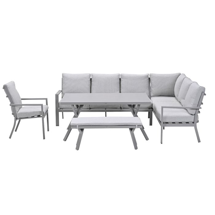 De Senja lounge dining set is vervaardigd uit een onderhoudsvrij en weerbestendig aluminium met een stevige taupe kleurige poedercoating. Aluminium heeft als voordeel dat het onderhoudsvrij is, wanneer de set vies is geworden door bijvoorbeeld opspattend regenwater kan je dit eenvoudig schoonmaken met een sopje van groene zeep en een zachte doek. Ideaal! De tafel heeft een latten structuur en brede platte tafelpoten, hierdoor heeft de tafel een strak design. De lounge dining set is voorzien van verstelbare pootdopjes, hierdoor is deze makkelijk waterpas te zetten.