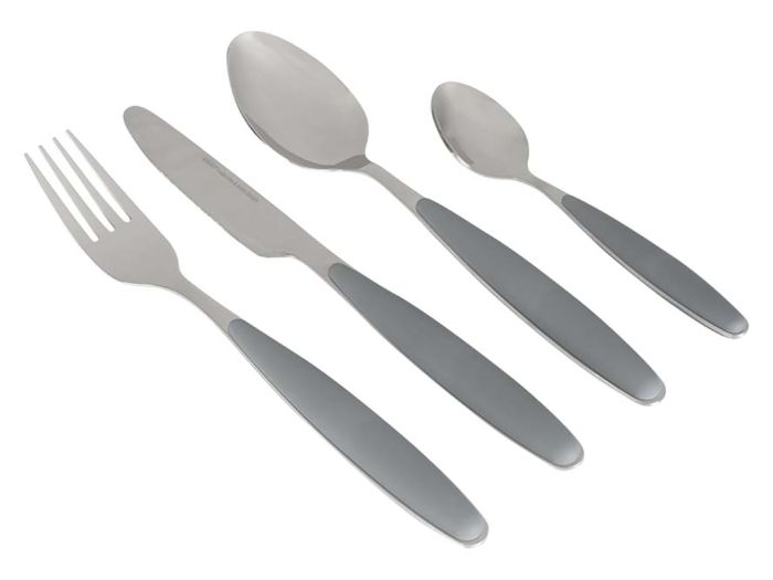 Een stijlvolle bestekset van RVS. Het bestek heeft een trendy grijze kleur. Met een soft touch heft zodat het bestek comfortabel in de hand ligt. De set bestaat uit 4x een mes, vork, lepel en theelepel en is bovendien geschikt voor in de vaatwasser. Matchend bij het melamine servies van Gimex. Afmetingen: Vork 21,5 cm, mes 23 cm, lepel 21 cm, theelepel 15 cm.