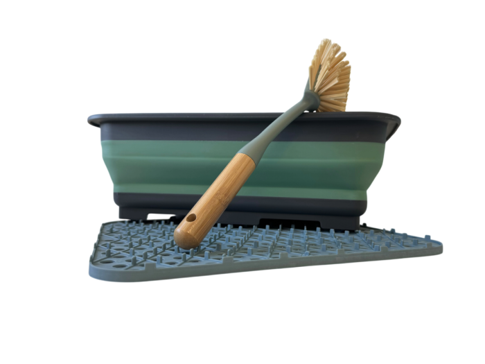 De set bestaat uit een opvouwbare afwasbak van 8 liter met handgrepen, een bamboe afwasborstel en een siliconen afdruipmat van 29,5 x 26 cm.