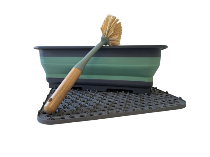 De set bestaat uit een opvouwbare afwasbak van 8 liter met handgrepen, een bamboe afwasborstel en een siliconen afdruipmat van 29,5 x 26 cm.