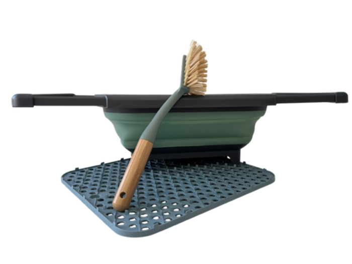 De set bestaat uit een opvouwbare afwasteil van 8 liter met ingebouwde stop en handgrepen, een duurzame bamboe afwasborstel en een blauwe siliconen afdruipmat van 29,5 x 26 cm.