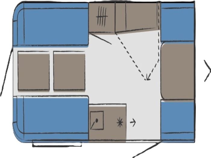 Dubbele standaard zit, Middenkeuken, Slaapbank, Dwars bed, Dwars stapelbed, Kledingkast, Rondzit