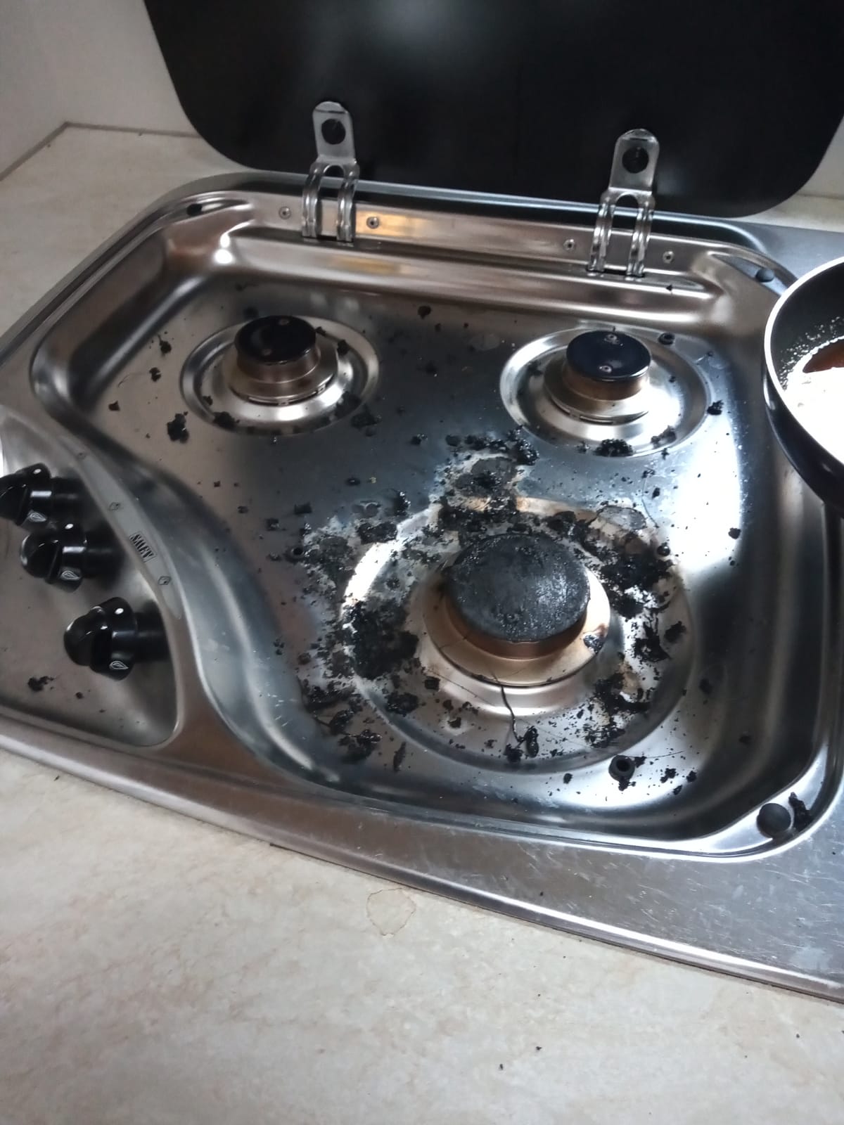 - Zeer brandbaarPlakte vast aan de hete pan, die weer op het fornuis ging.