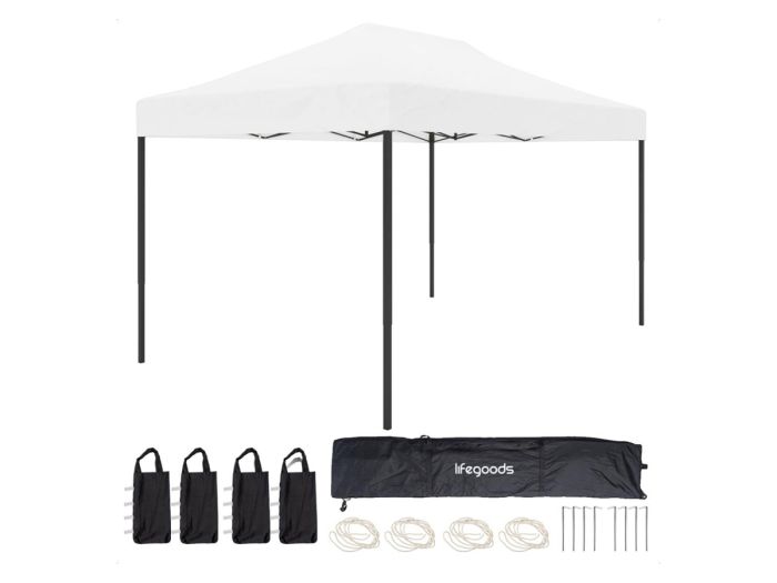 Laat je feestje niet verpesten door felle zon of regen! Deze partytent van LifeGoods is de perfecte oplossing! De tent is 297x440 cm groot en in hoogte verstelbaar (290-300-310 cm). Groot genoeg voor een gezellig feestje! De partytent is 100% waterdicht, dus regen is geen probleem. Dankzij het stalen pop-up frame klapt de tent in enkele minuten uit! Feestje afgelopen? Berg de partytent op in de stevige draagtas met wieltjes. Je kunt de partytent op gras, zand en hardere ondergronden plaatsen. Daarnaast is de partytent extra verstevigd en krijg je er scheerlijnen, haringen en zandzakken bij.