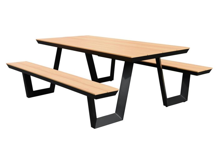 Een picknicktafel en eyecatcherin één. Dat is design picknicktafel Bermuda!Deze picknickset wordt geleverd met een prachtig driehoekdesign onderstel in mat zwarten beschikt over voldoende zitplekken voor een groot gezin.Op de banken kun je in totaal met 6-8 personen plaatsnemen. Ook zul je geen onhandige instapmomenten meer hebben met picknicktafel Bermuda. Waar je normaal gesproken je benen in een onmogelijke hoek moet gooien om over de bank heen te stappen, heeft deze picknickbankeen handige instapmogelijkheid aan de zijkant. Niet alleen eenstrakdesign, maar dus ook ontzettend praktisch!Naast zijn strakke design zal de tuintafel Bermudaook nauwelijksgaan verkleuren of splinteren. Bermudais namelijk gemaakt vanaluminiumen kunststof. Dit maakt het een onderhoudsarm product. Het tafelblad lijkt gemaakt van echt teakhout, maar is van kunststof en het onderstel is van aluminium. Door kunststofsamen te voegen met aluminium krijg je een lichte, maar sterke set. Je hoeft dus nauwelijksom te kijken naar het onderhoud en kunt lang genieten van deze prachtige design picknicktafel.Waarom worden wij zo blij van design picknicktafel Bermuda?