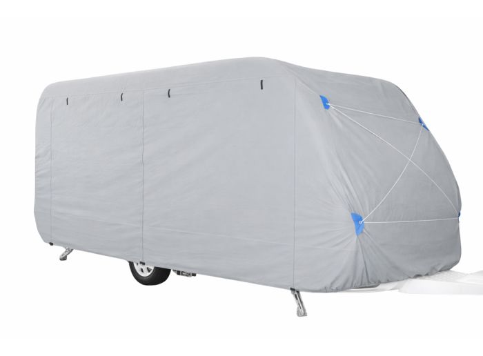 Dankzij drie ritsen aan één zijde kun je de caravan ook tijdens de stalling betreden. De elastische band in de zoom en de gespsluiting zorgen ervoor dat de hoes goed aansluit en stevig blijft zitten. Versterkte hoeken en verstevigde zeilringen verhogen de duurzaamheid.