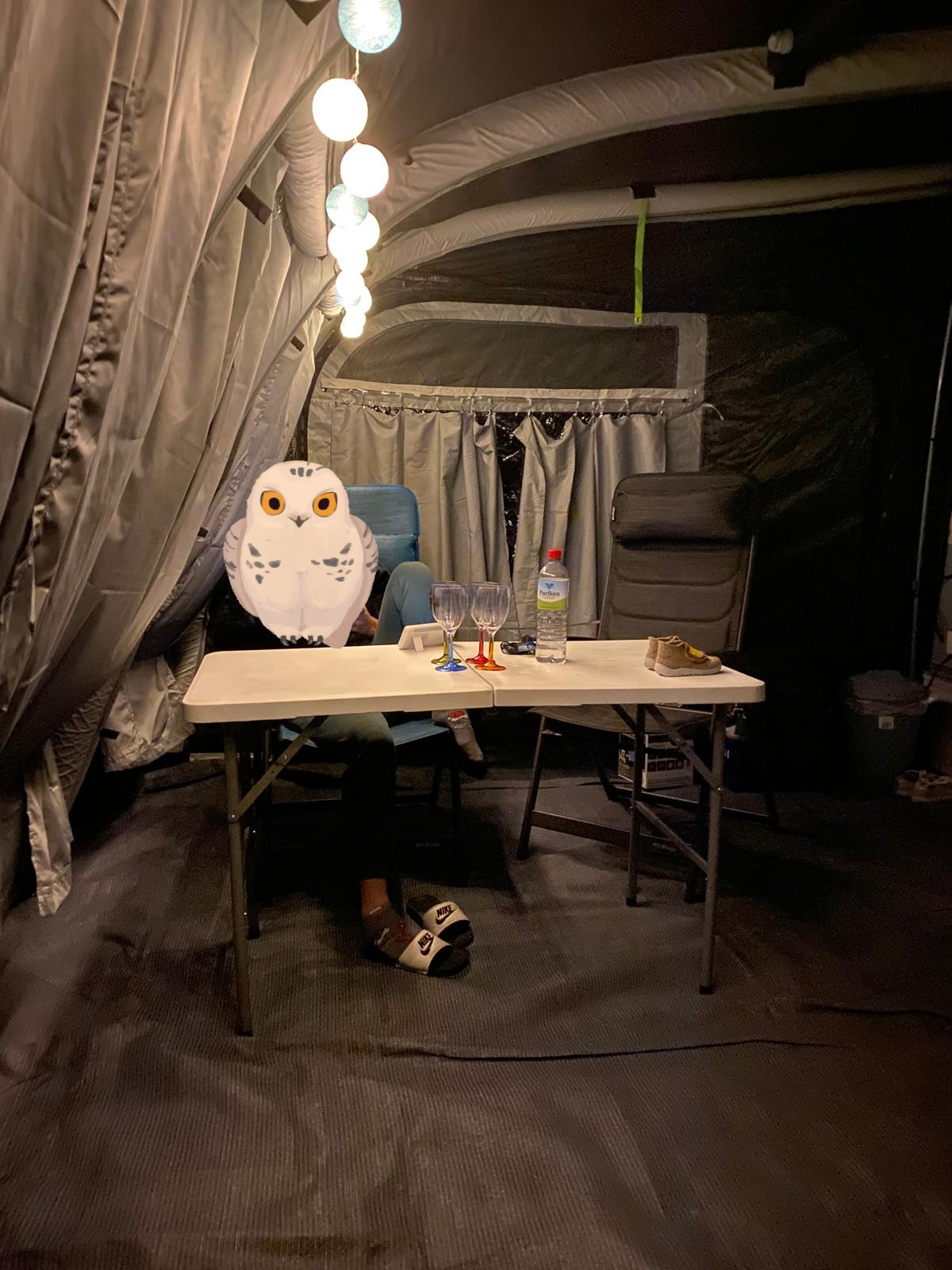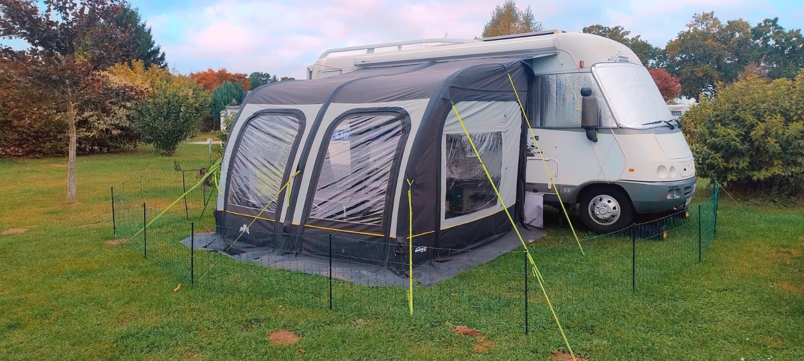 Deze tent, voortent of luifel is voorzien van opblaasbare luchtslangen i.p.v. tentstokken.