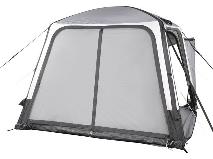 De zijwand is rondom volledig in te ritsen en heeft een rits in het midden. Hiermee kun je de zijwand eenvoudig openritsen en ervoor kiezen om één of beide flappen op te rollen. Zo creëer je een deur of een volledige doorgang, zonder de zijwand helemaal te hoeven verwijderen.