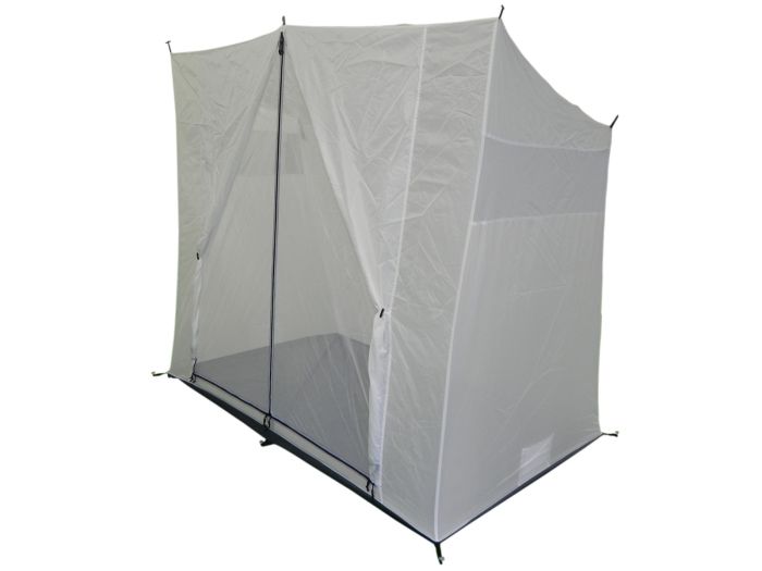 De binnentent biedt slaapgelegenheid aan twee personen en dankzij de rechte wanden kun je er ook een hoog luchtbed in plaatsen.