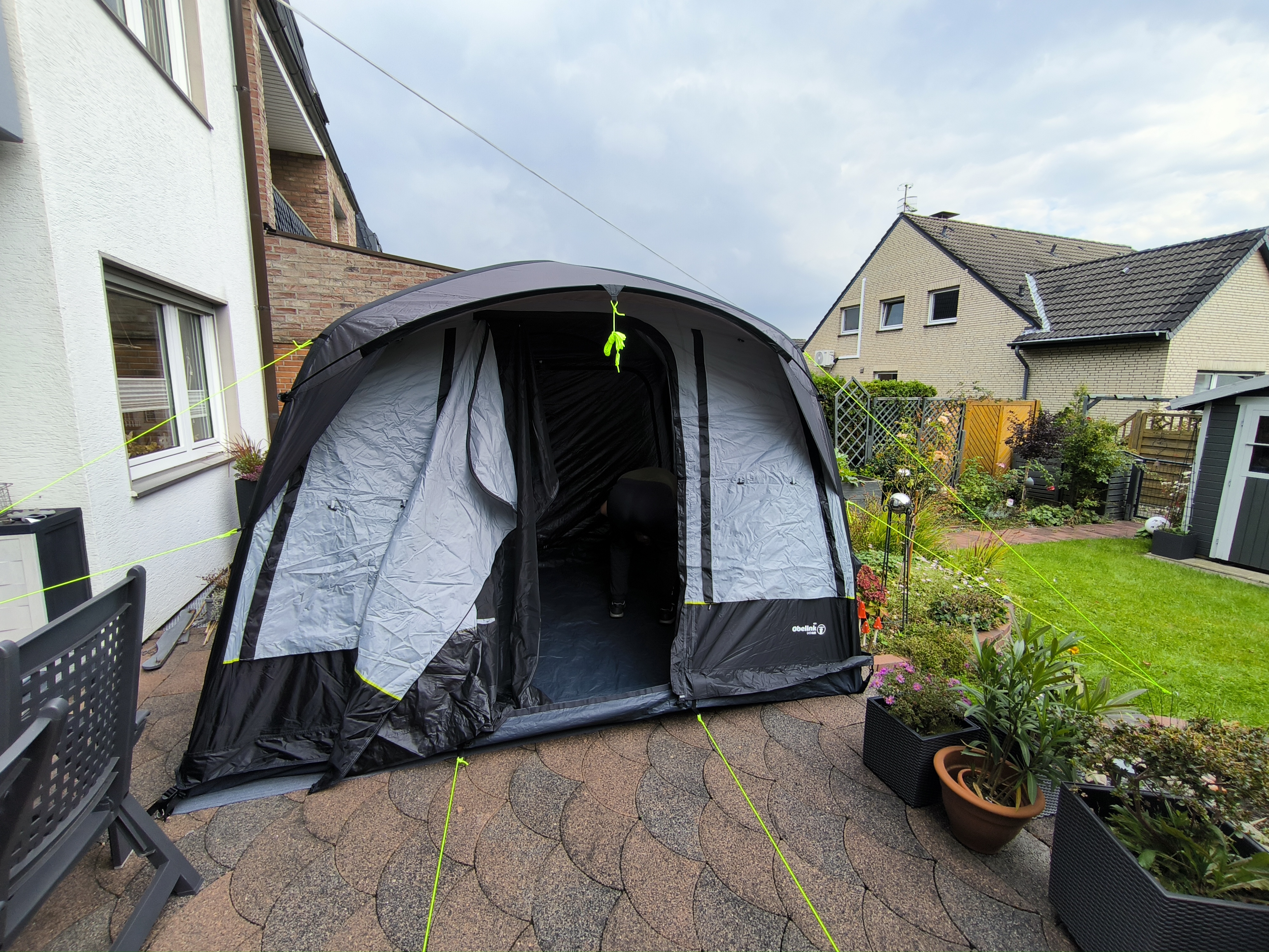 Deze tent, voortent of luifel is voorzien van opblaasbare luchtslangen i.p.v. tentstokken.