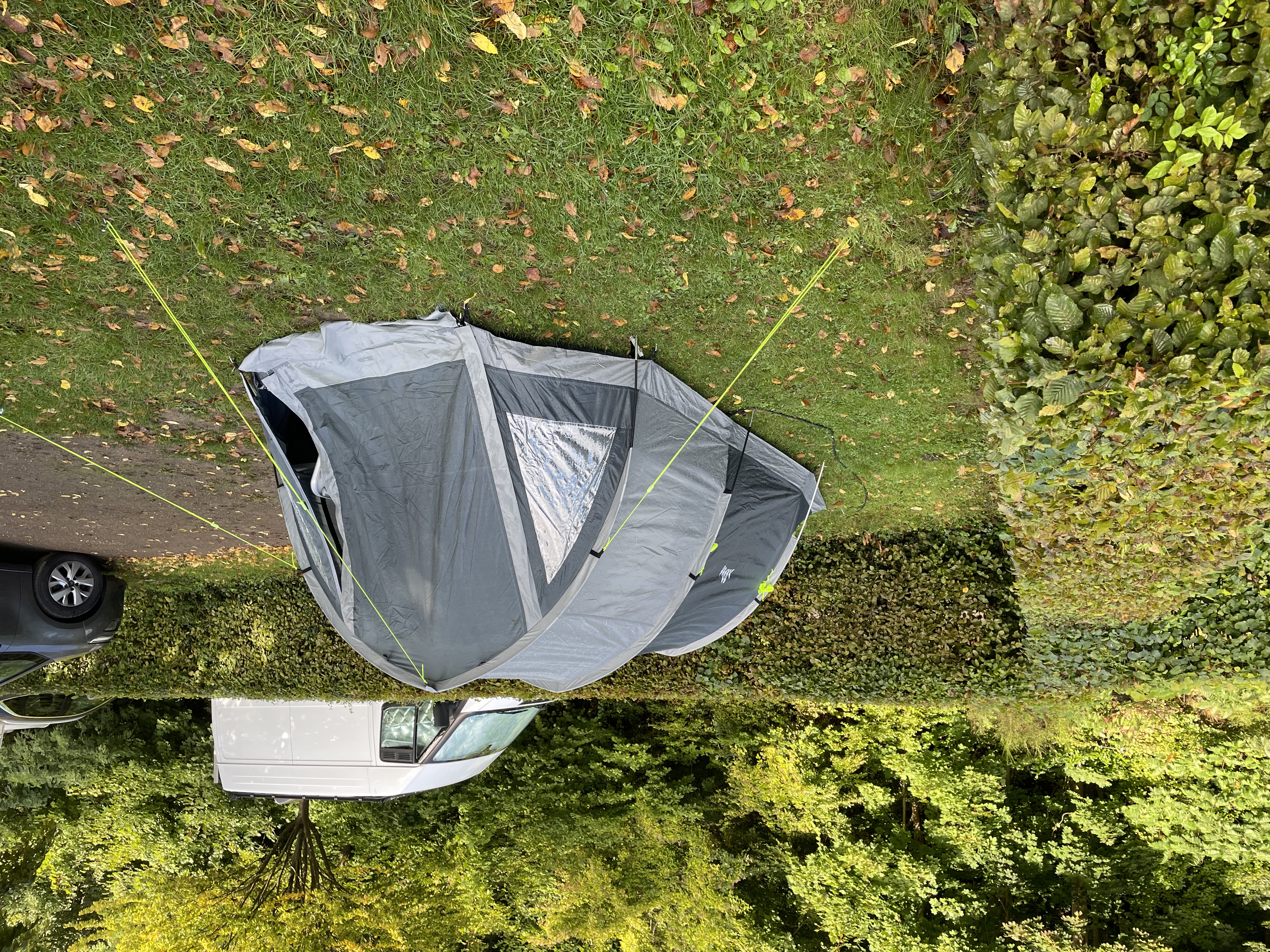 Deze tent, voortent of luifel is voorzien van opblaasbare luchtslangen i.p.v. tentstokken.