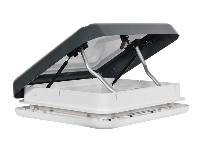 De koepel is enkelwandig en open je eenvoudig met een hendel aan de binnenkant. Twee gasveren houden het luik netjes open. Wil je alleen ventileren? Dan kun je het ook vastzetten in de ventilatiestand.
