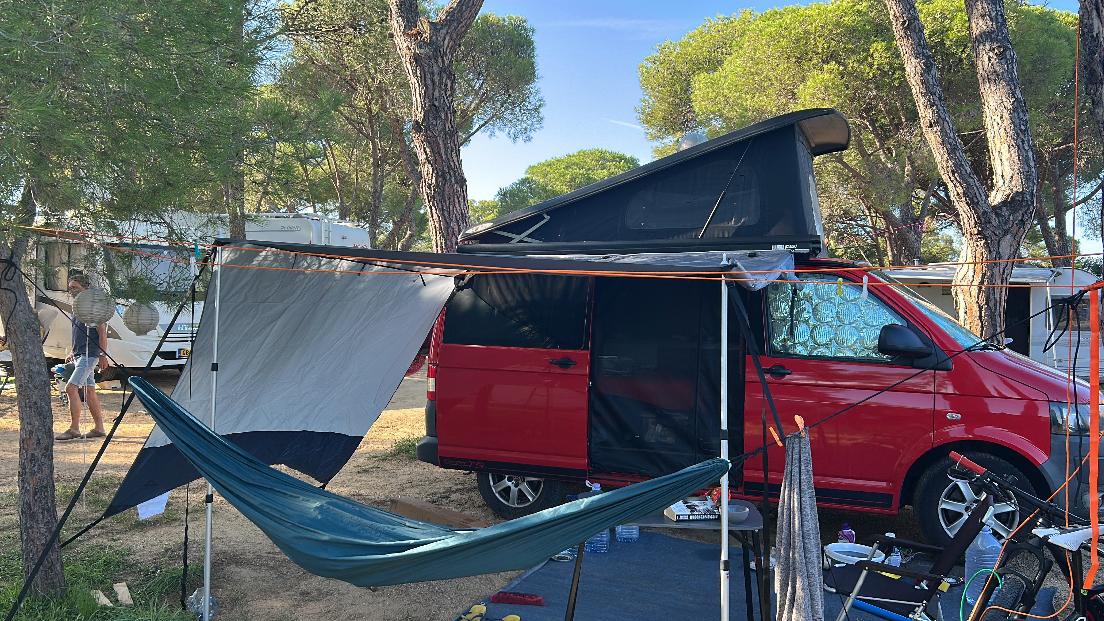 De bustent of campertent zit over deze lengte met het voertuig verbonden.