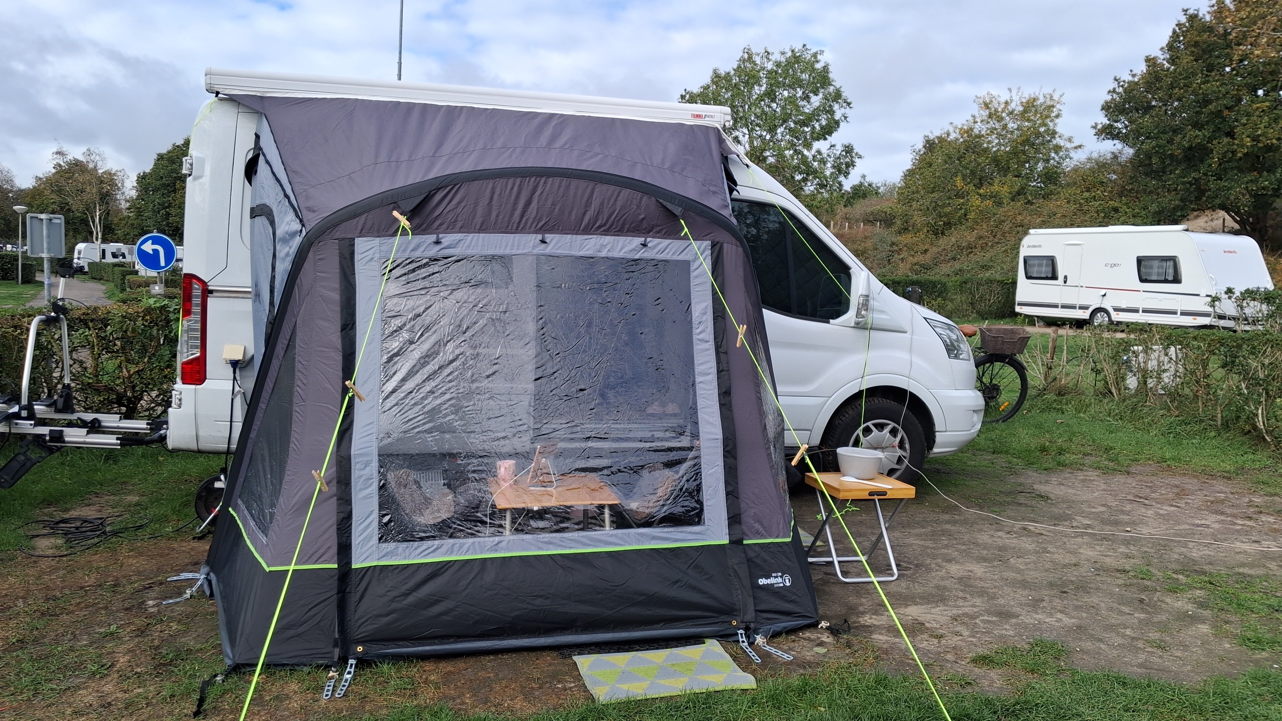 Gebruik de Rio 280 als overdekt voorportaal voor de caravan of camperdeur of als compacte voortent met twee stoelen en een klein tafeltje.