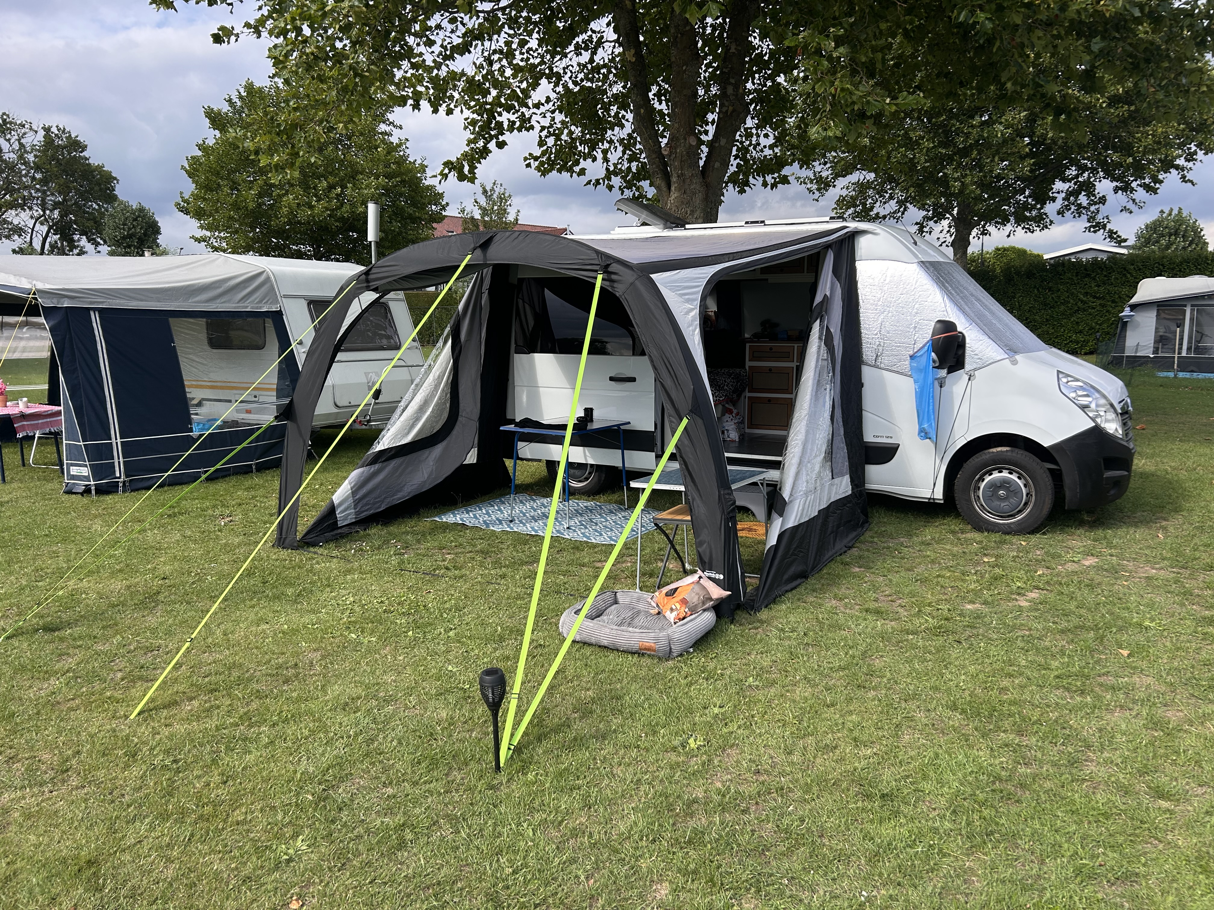 Deze tent, voortent of luifel is voorzien van opblaasbare luchtslangen i.p.v. tentstokken.