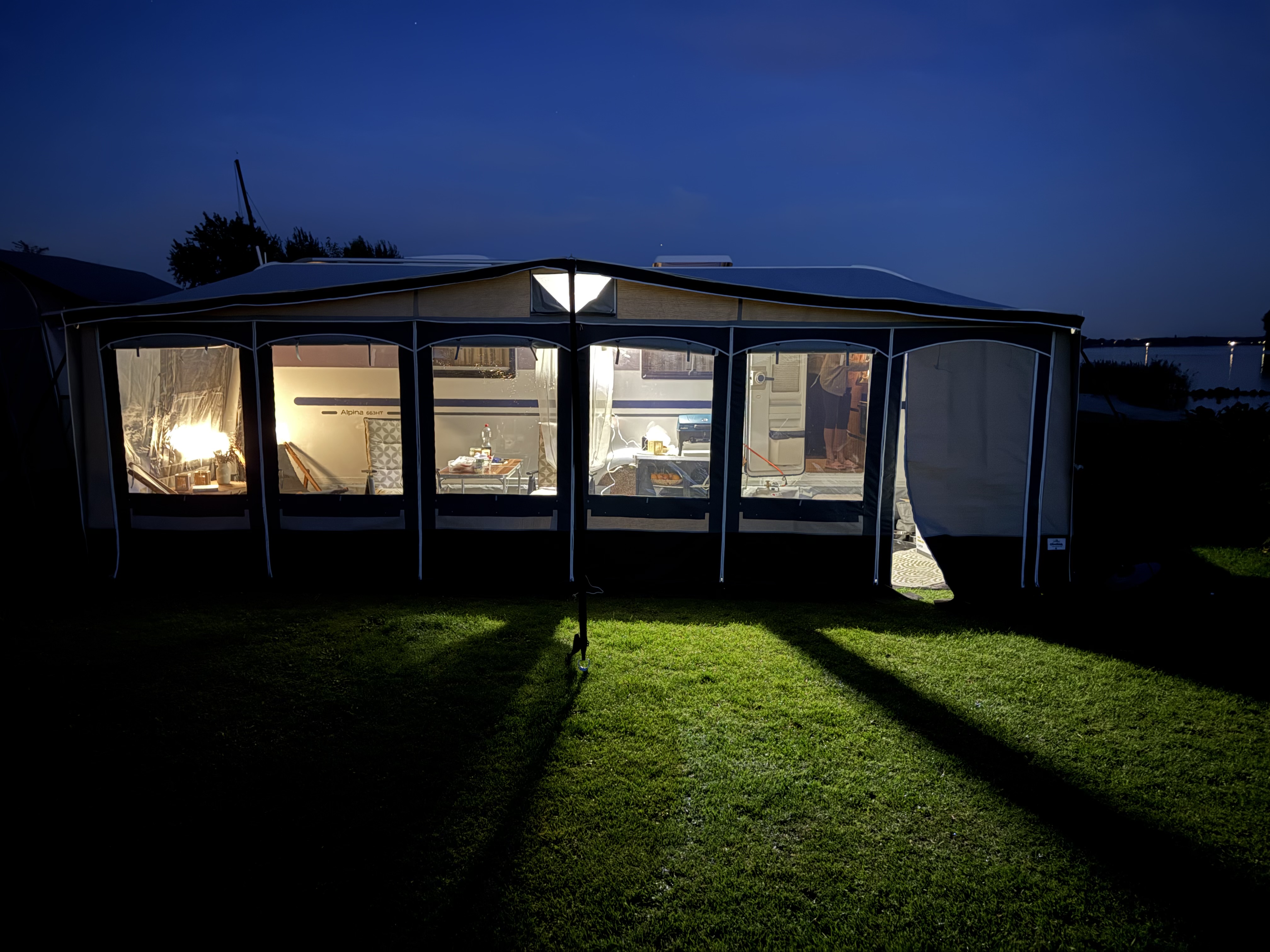 Deze tent, voortent of luifel is voorzien van opblaasbare luchtslangen i.p.v. tentstokken.