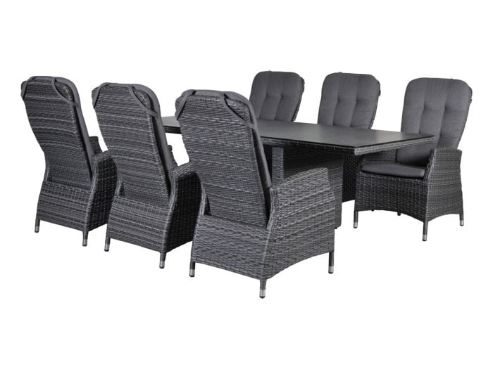 De Outdoor Feelings Santos Comfort dining 220 diningset heeft zes stoelen en een strakke tafel met een glasplaat.