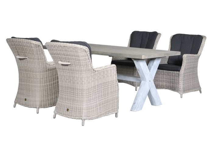 Houd je van hout en lichte kleuren en gaat je voorkeur uit naar landelijk meubels? Dan is deze Studio Sentrail tuinset waarschijnlijk perfect voor jou! Deze set bestaat uit een tafel met een wit houten kruispoot met daarop een blad van acacia hout. Het blad is voorzien van een greywash waardoor de tafel licht van kleur is en een mooie vergrijsde look heeft. De vier tuinstoelen zijn afgewerkt met kunststof wicker en voorzien van een comfortabel zit- en rugkussen. Hierdoor biedt de stoel veel zitcomfort en kun jij uren in de tuin zitten.