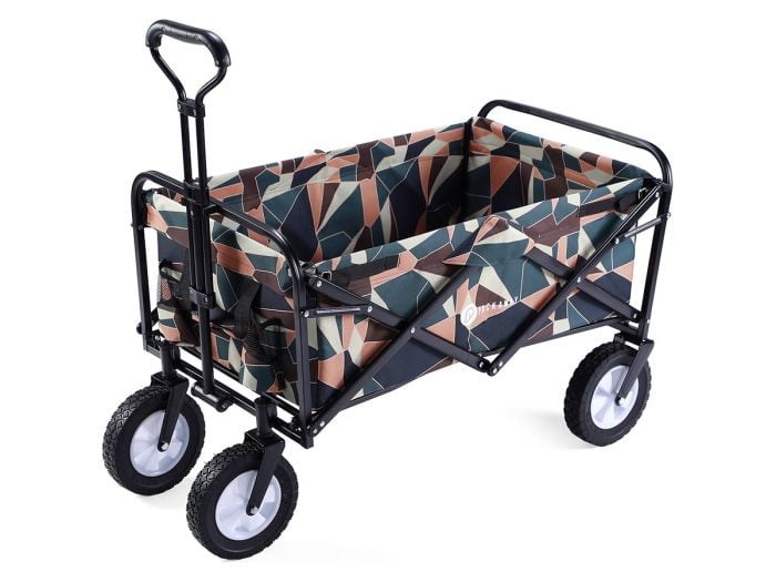 Deze handige vouwwagen is uitgerust met grote, 360° draaibare terreinwielen (diameter 18cm x breedte 10cm), kan ook worden gebruikt op strandzand. En het verstelbare handvat kan worden verlengd tot 107 cm, het kan worden vastgezet op de gewenste lengte.