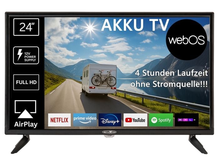 24" draadloze batterij-tv De TV waar u ook bent >> 4 uur tv kijken zonder externe voedingsbron! 24" (60 cm) breedbeeld LED-televisie met DVB-T/T2, DVB-S/S2, DVB-C en CI +Slotresolutie: 1920 x 1080 Contrast: 3000:1 Kleuren: 16,7 miljoen Meertalig menu (OSD) Kijkhoek: Horizontaal 178° / Verticaal 178° Aansluitingen: RJ45, AV, DVB-S/S2, DVB-T/T2, DVB -C, OPTICAL (digitale audio-uitgang), HDMI (ARC-compatibel), USB, hoofdtelefoonaansluiting Leveringsomvang: afstandsbediening, 12V autokabel, 230V voeding, voetjes, houder, gebruiksaanwijzing Vesa Standard: 100 x 100 Afmetingen apparaat ( B/D/H): met standaard: 55 x 17,7 x 38,4 cm