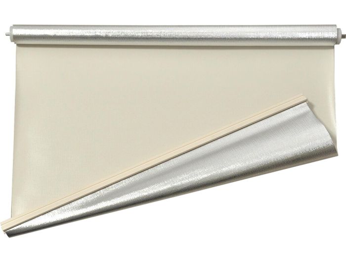 Het rolgordijn heeft aan de buitenzijde een aluminium coating en houdt maar liefst negentig procent van de warmte tegen.