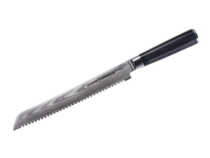 Het Damascus Bread Knife is een prachtig keukenmes geschikt voor professioneel gebruik. Het lemmet is van 67 lagen damast staal en de greepplaten zijn van G-10. De balans van het mes ligt aan de achterkant zodat het mes fijn in de hand ligt met snijden. Het lemmet loopt helemaal door in de handgreep, dit zorgt voor meer stevigheid. Dit Bread Knife is ideaal voor het snijden van alle soorten brood, cake en taart, het kan ook gebruikt worden voor het snijden van harde soorten fruit en groente zoals meloen en pompoen. Het mes blijft het langst mooi als deze niet in de afwasmachine gereinigd wordt.