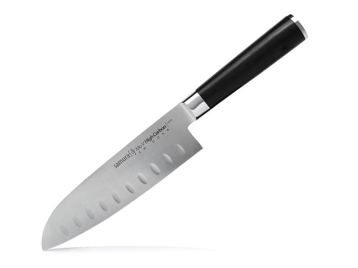 Het Samura Santoku Knife is een groot formaat keukenmes met een strak design. Het lemmet is van hoogwaardig AUS-8 roestvrij staal. Deze van origine Japanse staalsoort staat bekend om zijn taaiheid en scherptebehoud. Ook heeft het lemmet inkepingen zodat producten niet aan het mes blijven hangen. Het heft is van gepolijst G10. De balans van het mes ligt aan de achterkant zodat het mes fijn in de hand ligt met snijden. Dit Santoku Knife is geschikt voor vrijwel alle snijtaken maar is perfect voor plakken snijden, dobbelsteentjes maken en fijnsnijden. Het mes blijft het langst mooi als deze niet in de afwasmachine gereinigd wordt.
