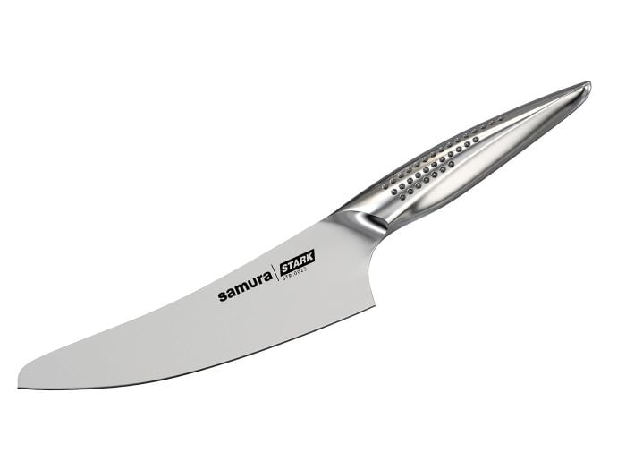 De Samura Stark Utility Knife keukenmes geschikt voor professioneel gebruik. Het heft is getaperd en heeft een holle binnenkant zodat deze erg licht is, door zijn getextureerde zijden heeft de Stark meer dan voldoende grip. Het schitterend vormgegeven lemmet is van AUS-8 roestvrij staal, deze van origine Japanse staalsoort staat bekend om zijn taaiheid en scherptebehoud. Het lemmet loopt naadloos door in de handgreep, dit zorgt voor meer stevigheid en geeft het mes een eigentijdse uitstraling. Dit Utility Knife is met zijn compacte lemmet perfect voor het snijden van aardappelen, groente en fruit. Verder leent zijn universele vorm zich voor het verwerken van vlees of vis. Het wordt aangeraden dit mes niet te gebruiken met bevroren voedsel. Het mes blijft het langst mooi als deze niet in de afwasmachine gereinigd wordt.