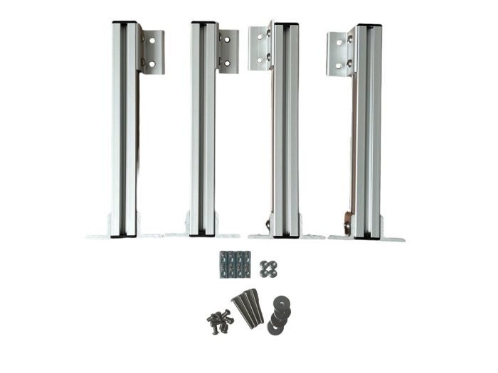 Verhogingsset voor schuifplateau van 60, 80 of 90 cm diepte. Dit systeem is uitgevoerd in systeemprofiel 30x30 mm en wordt geleverd inclusief alle benodigde bevestigingsvoeten en montagematerialen. De set bevat 4 verhogingspoten, waarmee de totale hoogte maximaal 25 cm kan worden verhoogd (geschikt voor een verhoging tot 17 cm). Schuifplateaus of foto's ter illustratie.