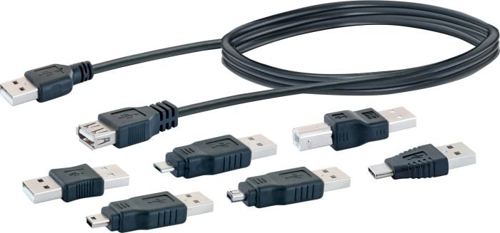 Deze 7-delige Schwaiger aansluitset bestaat uit een USB 2.0 verlengkabel en 6 USB 2.0 adapters. De set is geschikt voor het aansluiten van alle gangbare apparaten met USB 2.0-interface op bijvoorbeeld een PC of laptop. Het werd in elkaar gezet voor opladen en gegevensuitwisseling via USB interface. Gegevens worden bidirectioneel overgedragen met een snelheid tot 480 Mbps.