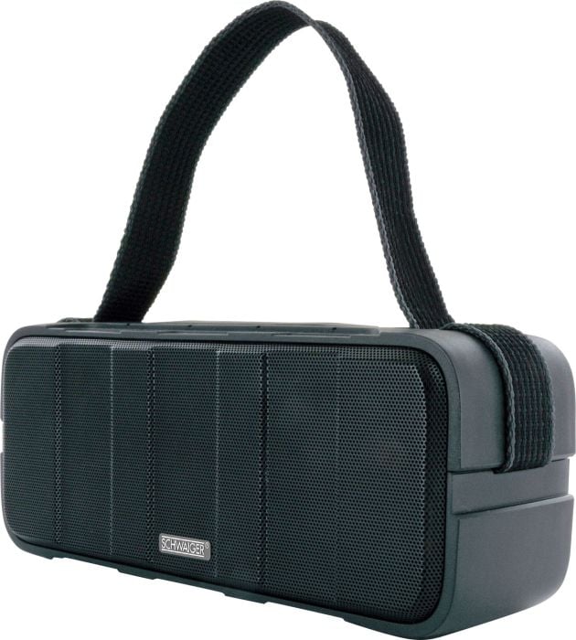 Met de draagbare Bluetooth®-luidspreker van Schwaiger kan jij overal met uitstekend geluid genieten van de muziek die je afspeelt op jouw smartphone of tablet. In overeenstemming met zijn afmetingen is de luidspreker uitgerust met twee uiterst krachtige luidsprekers en staat zo garant voor een krachtig geluid. En dankzij de lange levensduur van de batterij en de praktische en verstelbare draagriem is de luidspreker de ideale metgezel voor onderweg. Bovendien maakt de compacte luidspreker indruk met zijn robuuste en waterdichte ontwerp en is daarom ook perfect geschikt voor allerlei buitenactiviteiten.
